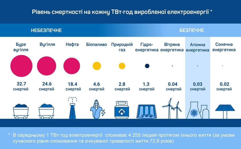 Рівень смертності, пов’язаний із виробництвом електроенергії в атомній енергетиці, є значно нижчим в порівнянні з іншими джерелами.